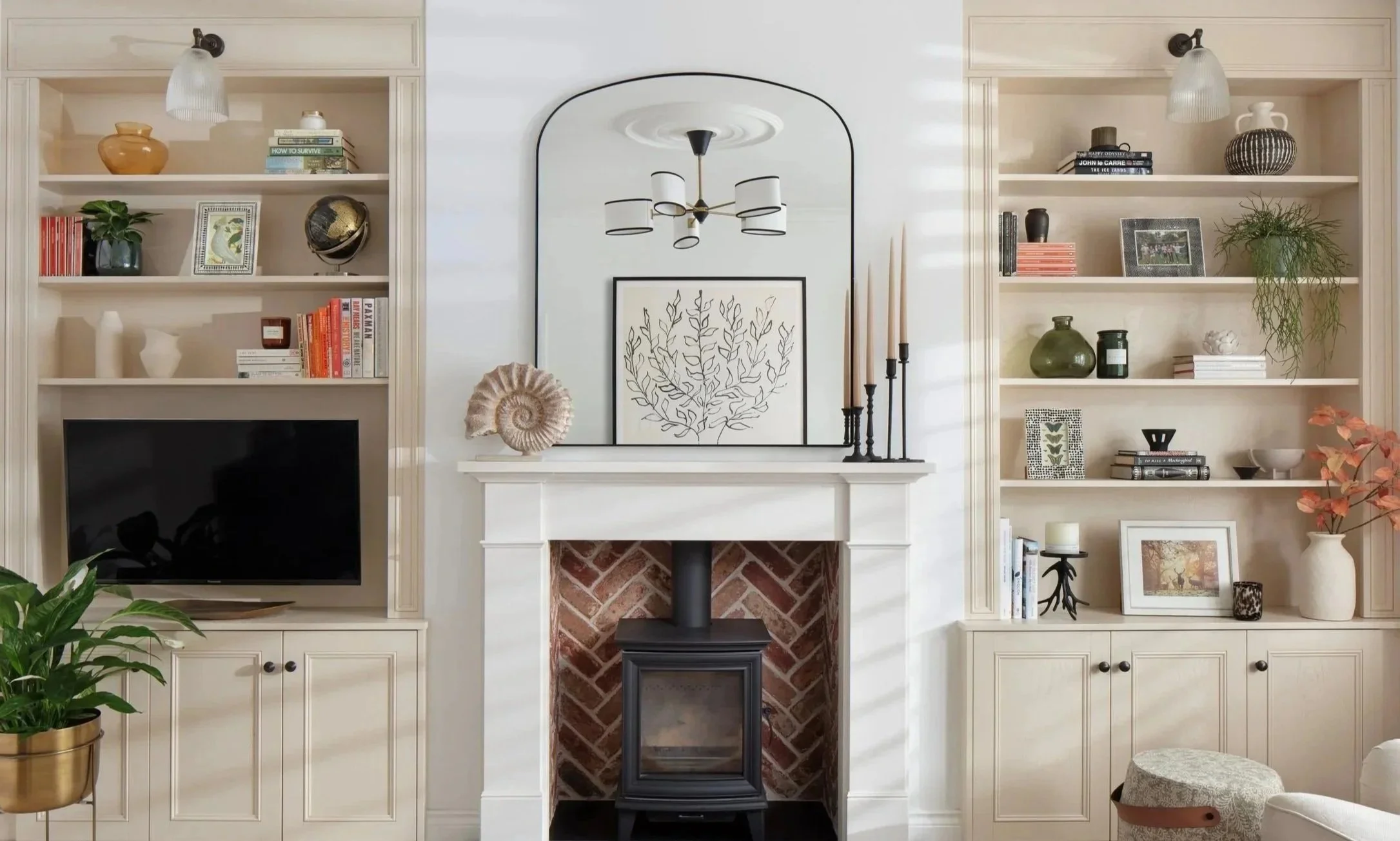 Living room with a cream sofa, colourful cushions, light green walls, Neptune textured large framed wall, a side table with vases and flowers, a coffee table with books and candles.