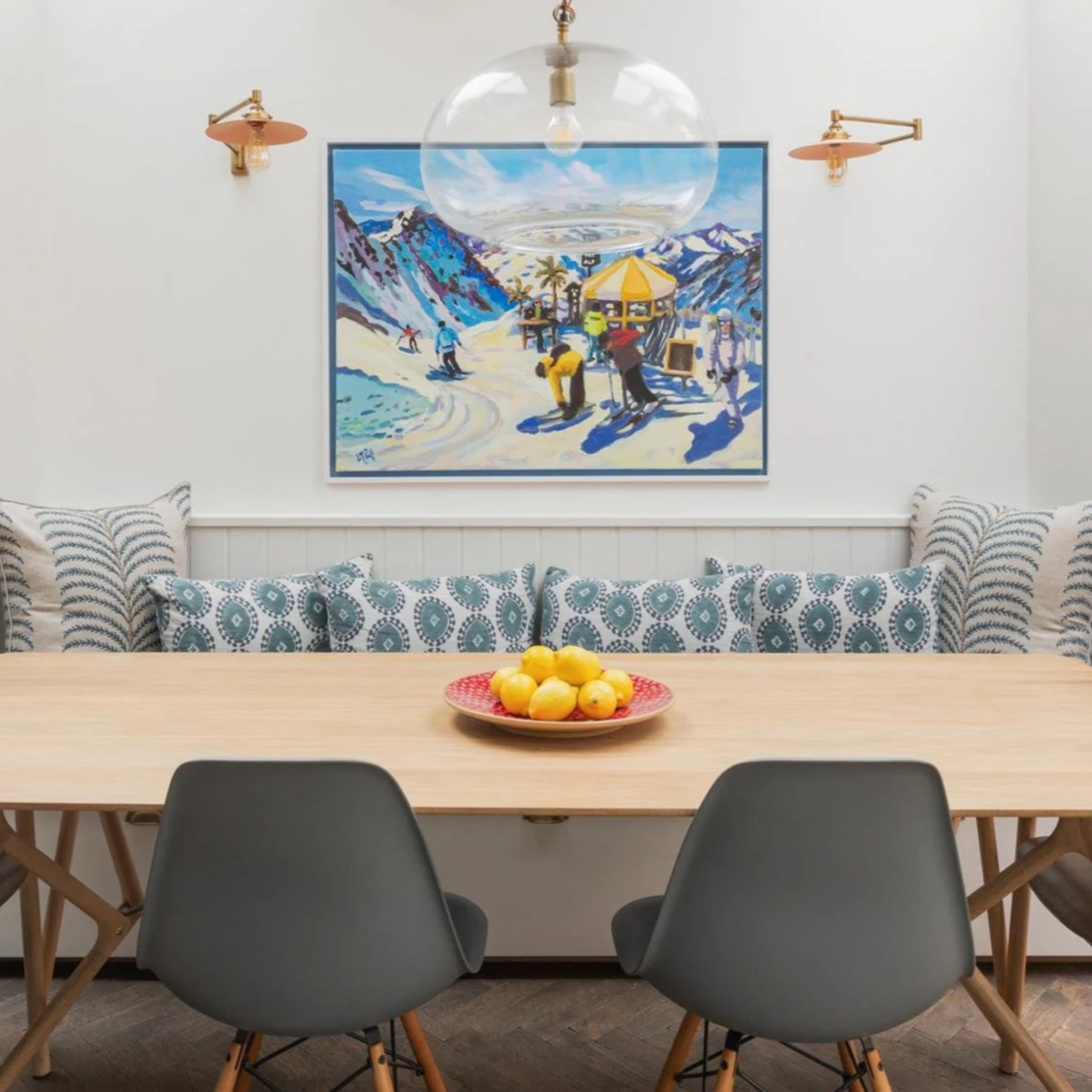 • A modern dining room with built-in bench seating between tall cabinets. Pooky glass globe pendant and wall-mounted pink sconces. Colourful painting and patterned cushions.